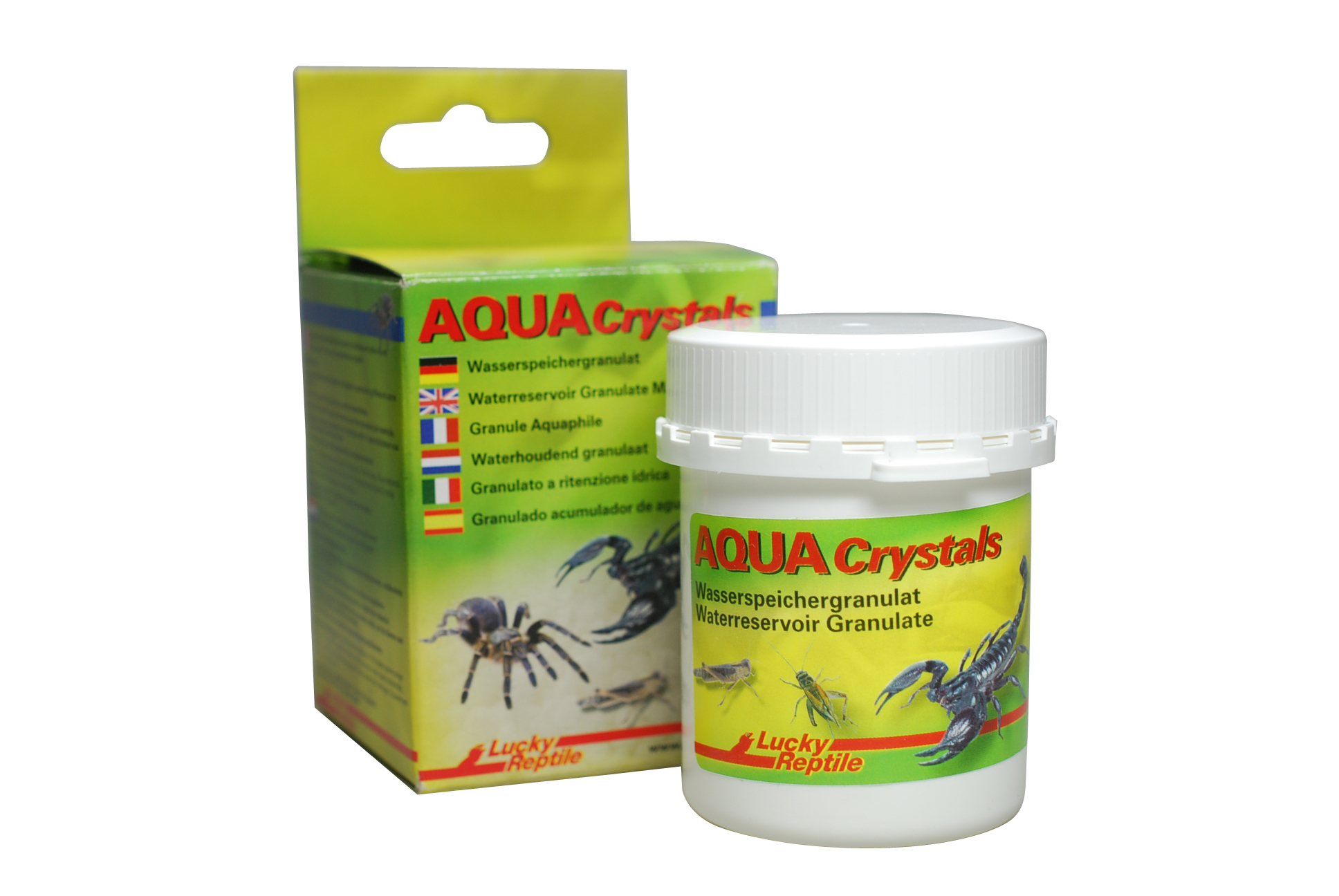 Lucky Reptile Aqua Crystals consists of a granulate that will swell up to "jelly" if water is added. The "water jelly" is very flexible in its use. It is an excellent water source for spiders, scorpions, feeding insects, etc. and can also be used to provide water to small animals during transport or a long-term water source in cages (i.e. when on vacation). You can also mix vitamins, minerals and medication into the "jelly" to ensure an optimal maintenance of your animals. Aqua Crystals can also be mixed under the substrate to increase its water storage abilities and the humidity inside the terrarium.