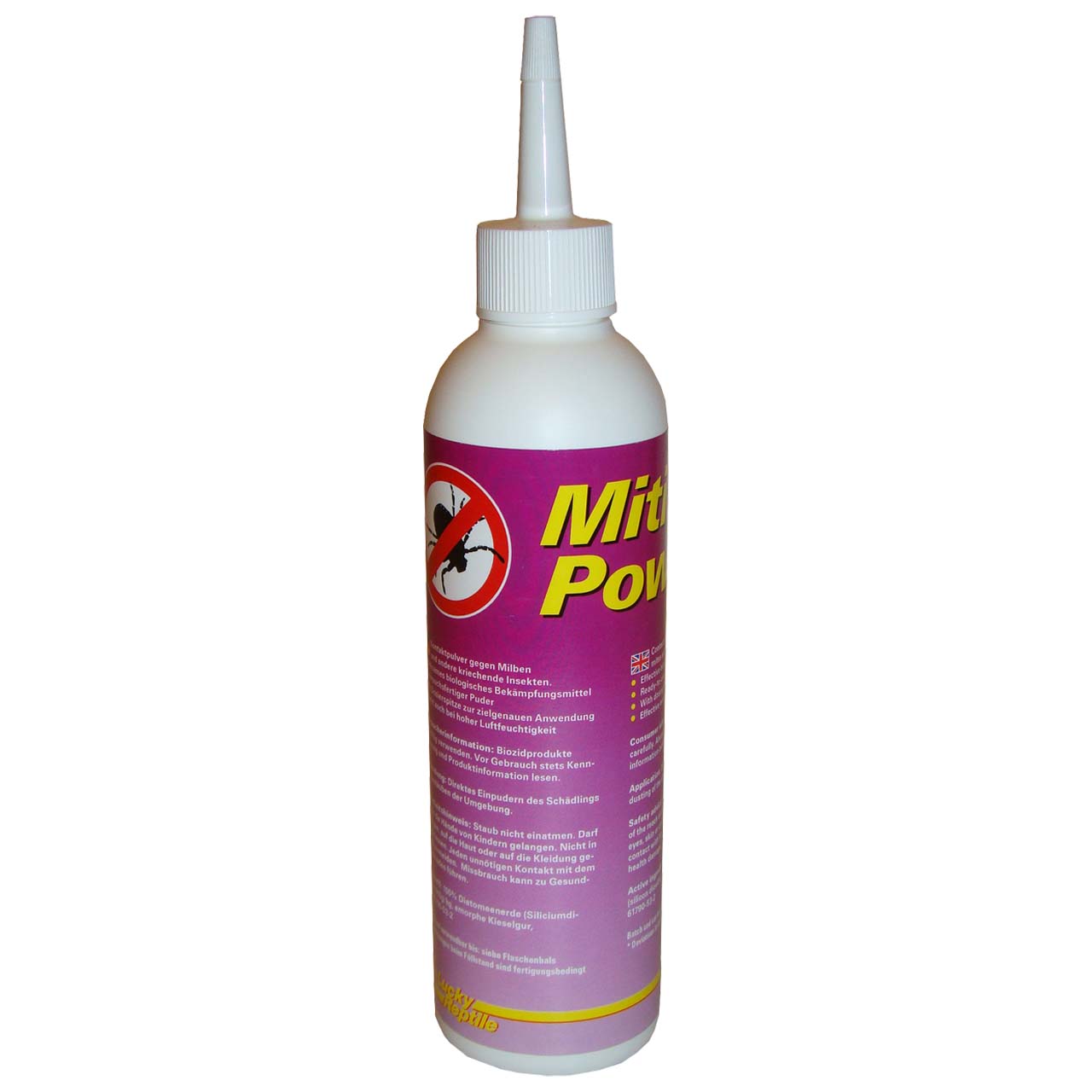Miti-Powder is an effective remedy against mites, ticks and other small invertebrates. It is apowder that acts by injuring the protecting wax layer and the chitin shell of the vermin whichcauses them to dry out. Miti Powder does not kill with chemicals processes, it acts purelyphysical! Thanks to the thin tip the powder can directed directly on the single mite or tick. Thisallows the use in conjunction with big arthropods like tarantulas or millipedes. With reptilesMiti Powder ist be “sprayed” in the surrounding of the animals. When used properly the animalscan be left inside the vivarium. A high humidity has no effect on the effectiveness of thetreatmeant.Use biocides safely! Consult markings and product information before use!