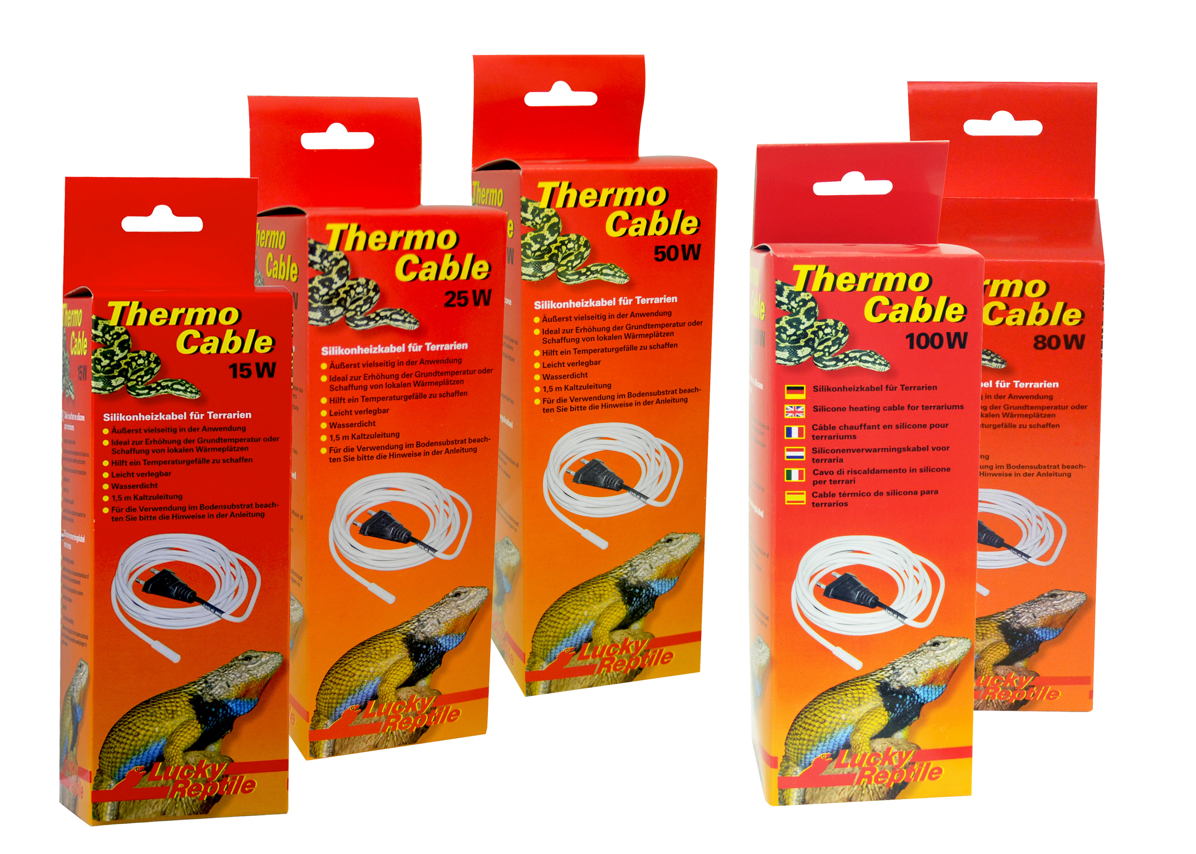 Das Lucky Reptile Thermo Cable ist ein einadriges 230V Silikonheizkabel, das sich durch ein exzellentes Preis/Leistungsverhältnis auszeichnet. Das Kabel selbst ist relativ dick, heizt dafür aber um so besser. Es kann auch im Terrarium verlegt werden, dabei sollte aber darauf geachtet werden, dass die Tiere nicht an das Kabel kommen können. Mit Eurostecker.