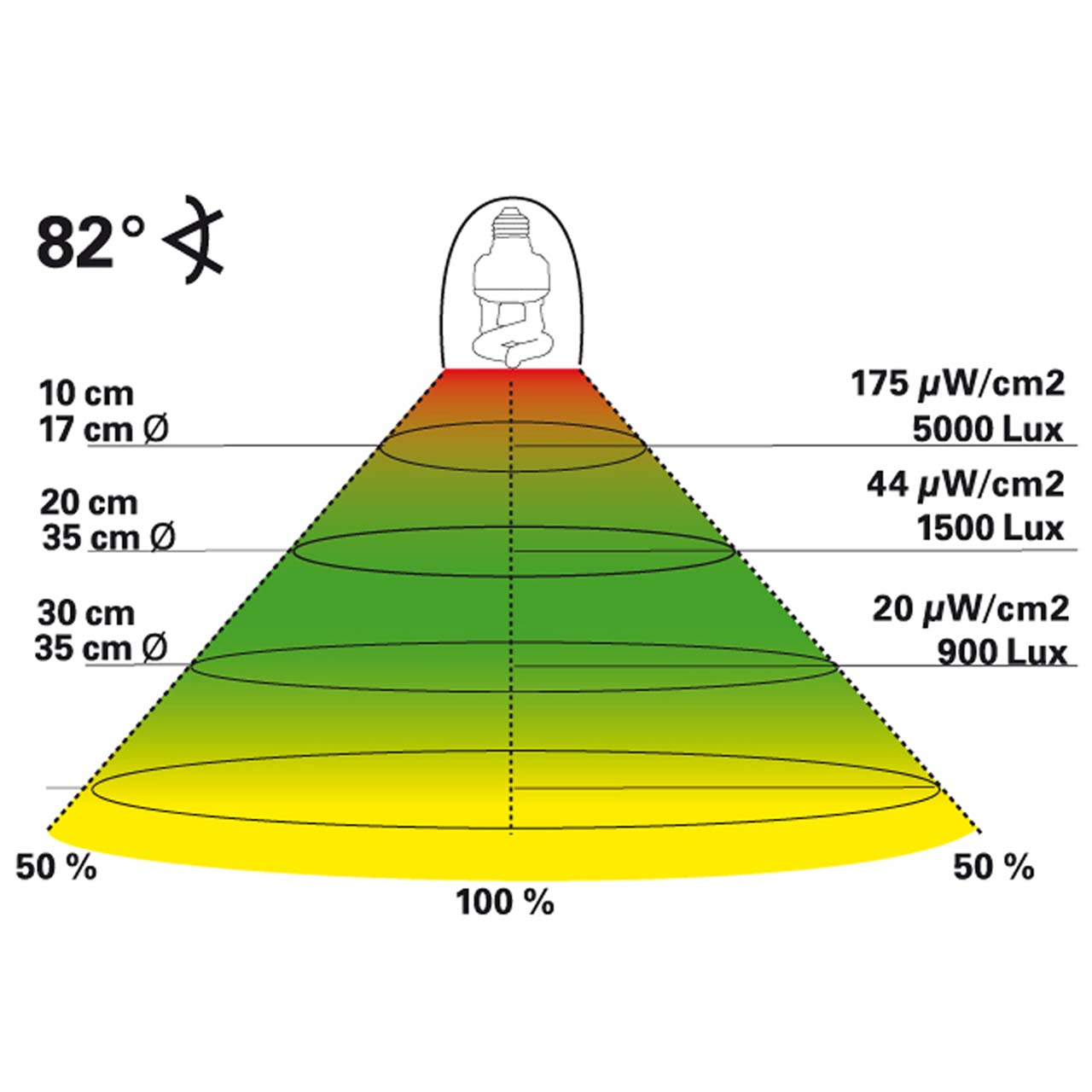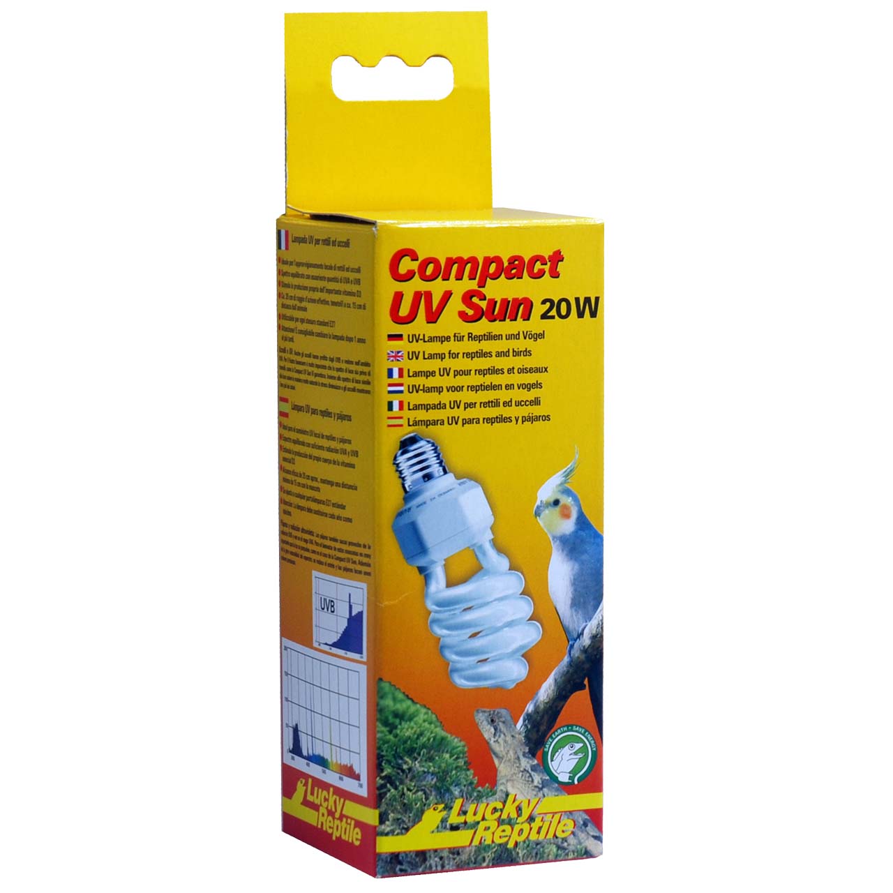 The Compact UV Sun has a similar balanced light and UV spectrumas the Lucky Reptile UV Sun T5 tubes. With this spectrumthe perfect compromise between sufficient UV radiation andnatural light in the visible range has been achieved. Contraryto tubes that are made for illuminating large areas, theCompact UV Sun is designed to create smaller UV and lightbasking sites.A prerequisite for optimal performance is a good reflector. Areflector can increase the radiation that reaches the animalby 200% and direct the light to where it is needed. Also areflector protects the animals from health problems. If you usea compact fluorescent UV lamp without reflector and it is possiblefor the animals through the cage furniture to sit on a similarheight or shortly below the UV lamp, the UV radiation can hit the eye atan unnatural angle which can cause eye problem. We therefore strongly recommend the use ofa reflector lamp like the Lucky Reptile Thermo Socket plus Reflector models HTR-1 and HTRP-1which also offer the best performance in combination with the Compact UV Sun.By the way, the Compact UV Sun is also excellent for use with birds!