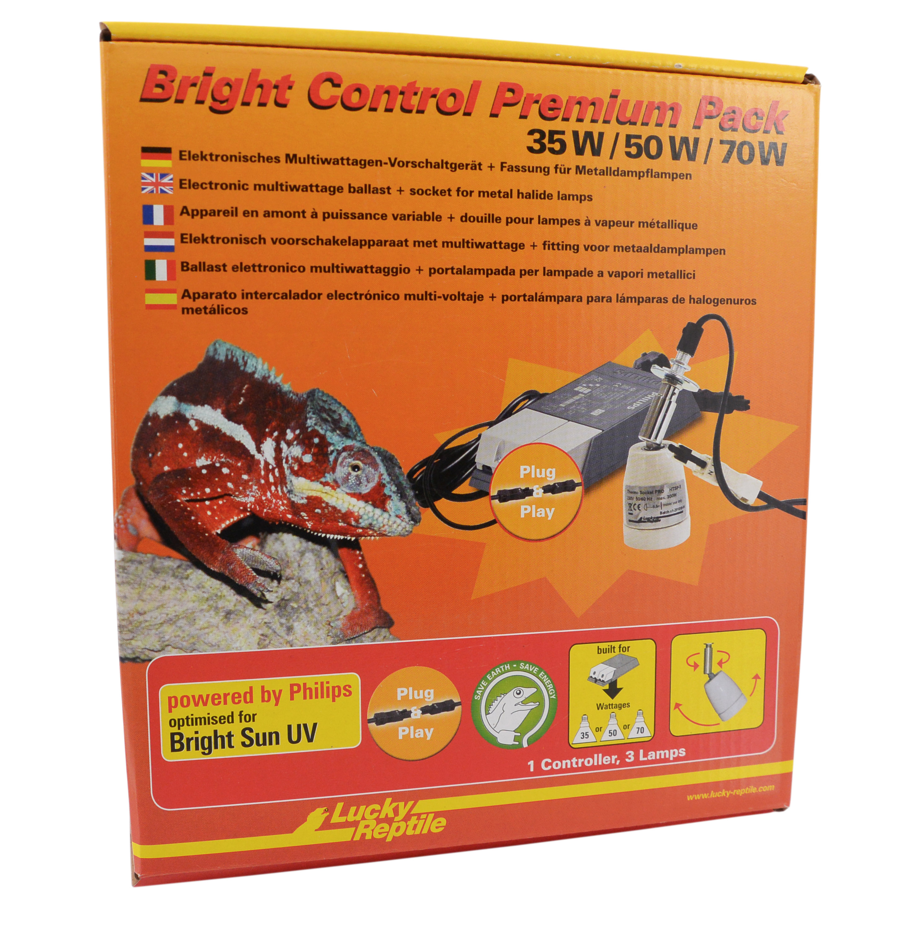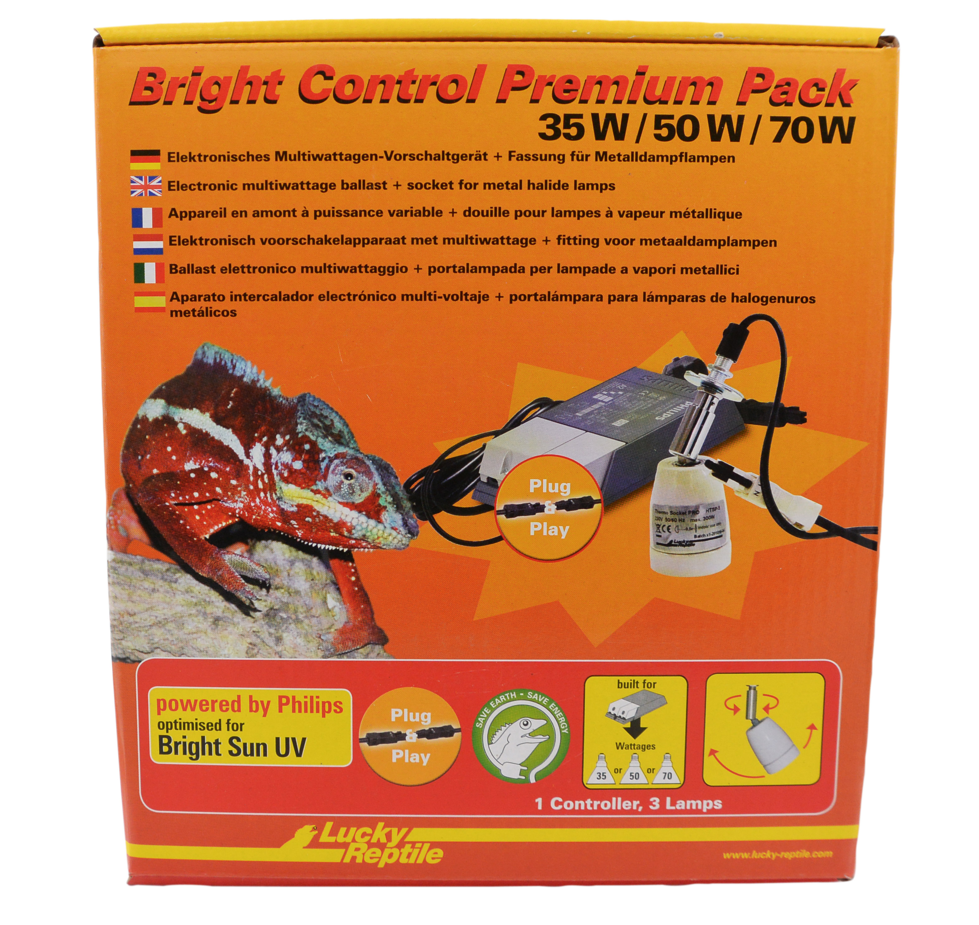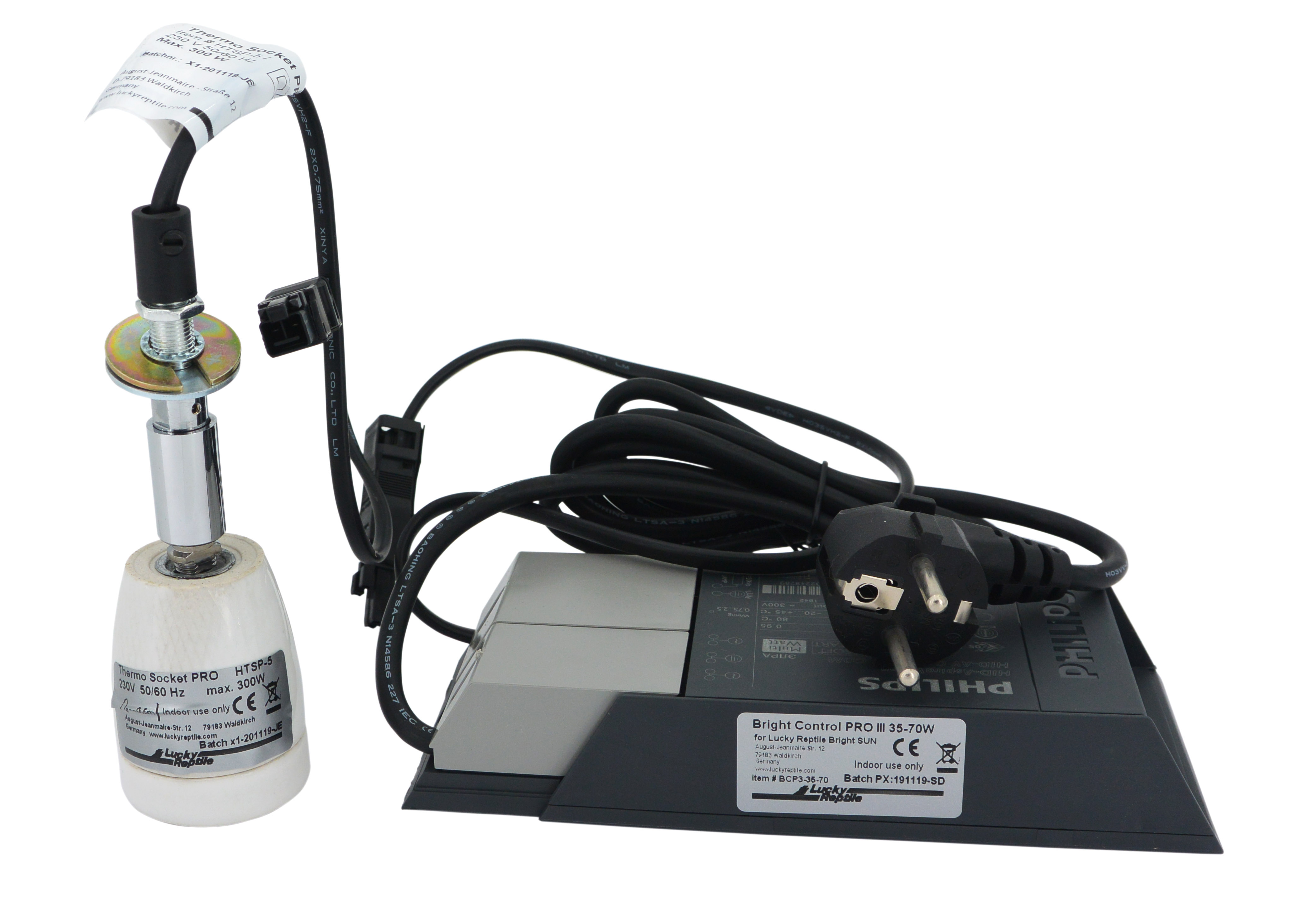 The Bright Control Premium Pack contains with the Bright Control PRO III the newest generation of multiwattage ballast and a Thermo Socket PRO luminaire with hinge that allows to flexibly direct the lamp as needed. Thanks to the Plug and Play connection the installation is very easy and possible without electric installation skills.A lamp is not included and has to be purchased separately. Since the ballast can be switched between different wattages, using all kinds of Bright Sun with either 35W, 50W or 70W is possible.A reflector with mesh protector can be retrofitted and is available in different colours.