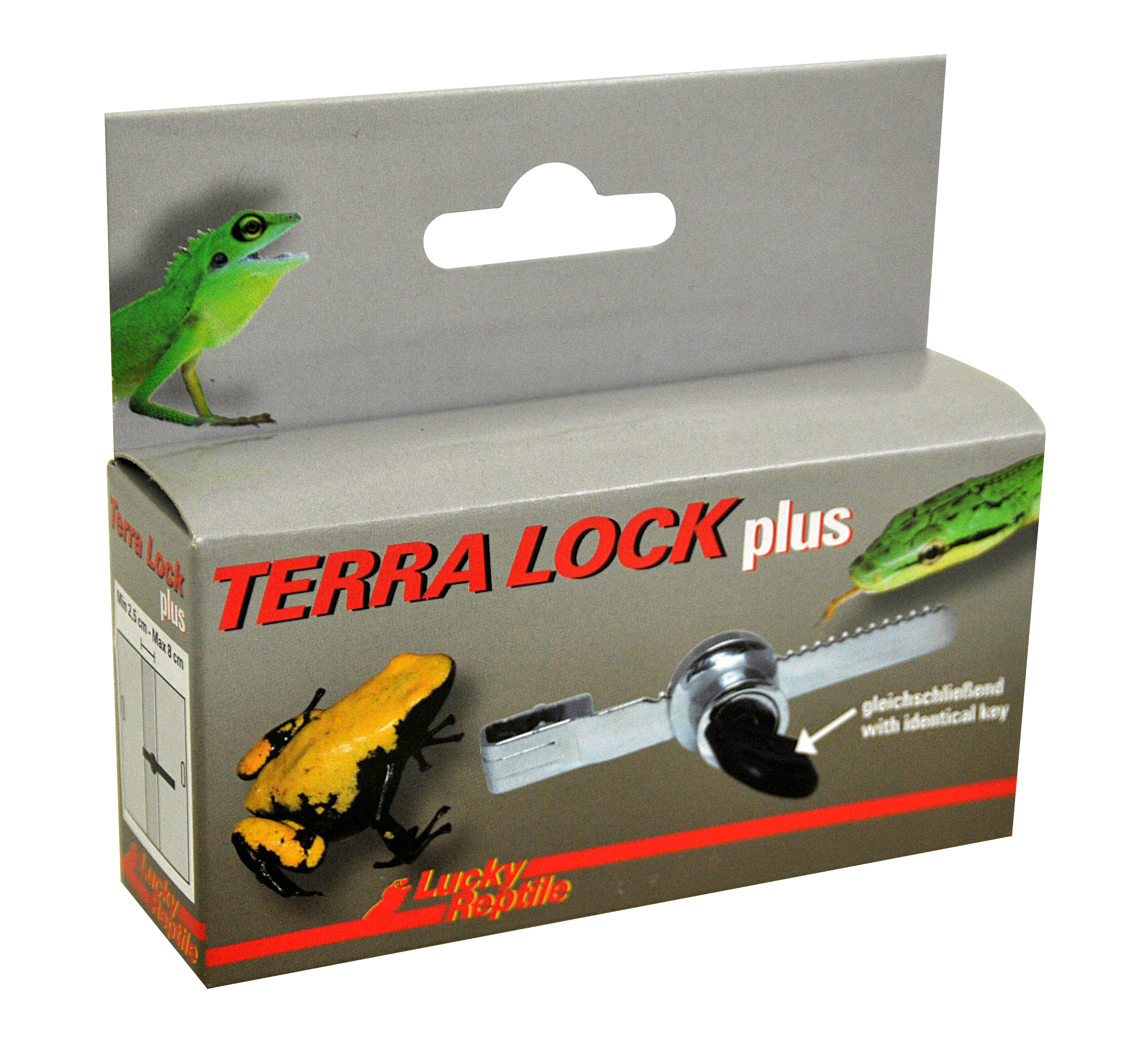 We have revised our popular Terra Lock sliding door lock. Thanks to its optimized lengthand gearing, there is now one size that fits all Lucky Reptile terrariums with sliding doors.In general it is suitable for all sliding doors with a maximum strength of 6 mm and anoverlap of 2,5 to 8 cm. For people having more than one terrarium or whole display setups,the Terra Lock Plus is available always supporting the same key. That means every TerraLock Plus bought can be opened with the same key thus saving the users fiddling withseveral keys. Unfortunately the keys are not compatible to the preceding Terra Lock model.