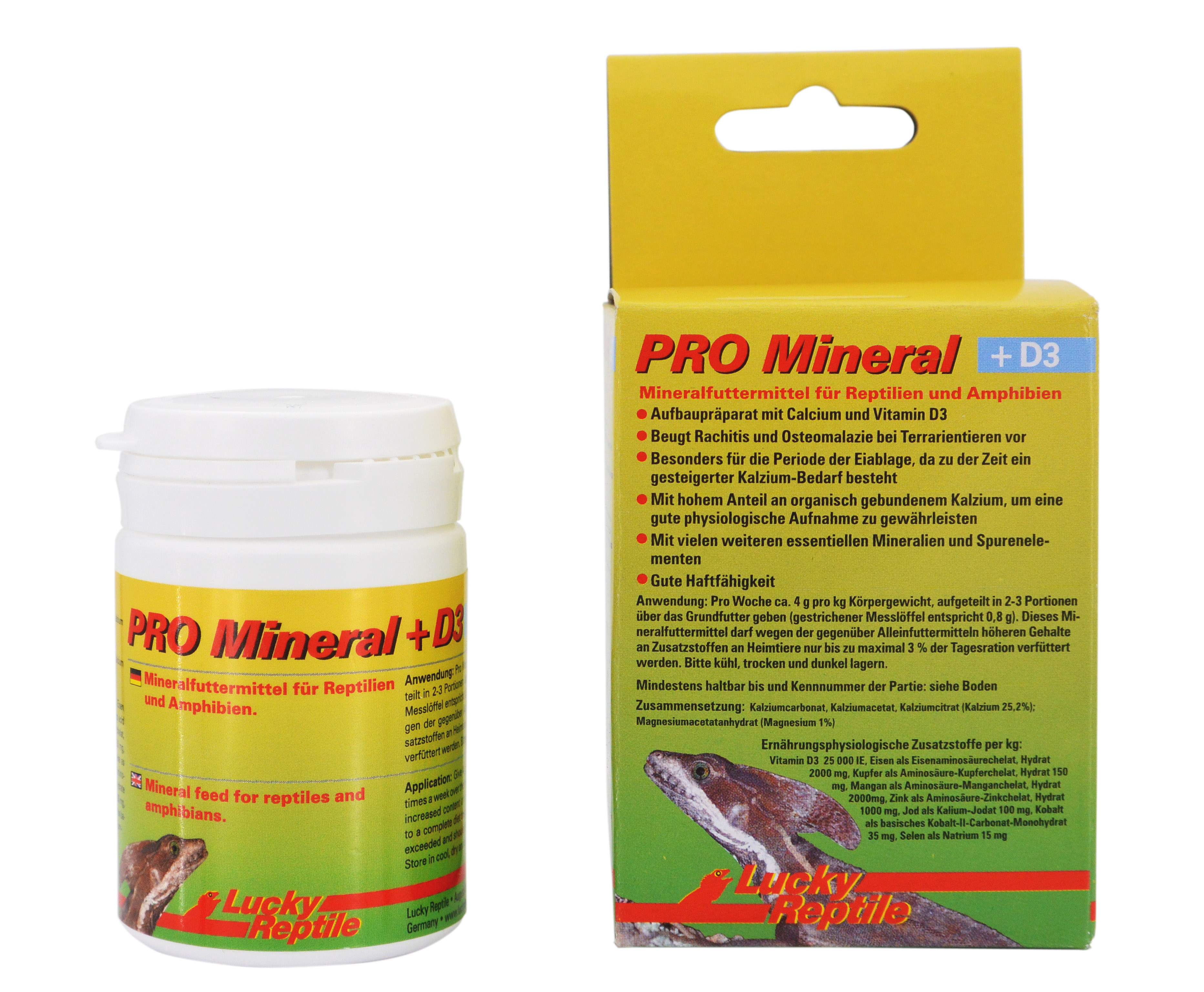 Pro Mineral D3 is a mineral supplement which contains vitamin D3 and organic bound calcium, which is easier for the body to absorb. Thanks to its good adhesion it stícks for a long time all over feeding insects body. Especially during the time of egg deposition and the growth it is reasonable to feed vitamin D3 and calcium, because the demand is higher than usual and there is the risk of a rachitis. PRO Mineral D3 also can be used to counteract deficiency symptoms. Of course PRO Mineral D3 also contains all other minerals and trace elements that have important functions in the animal's body.
