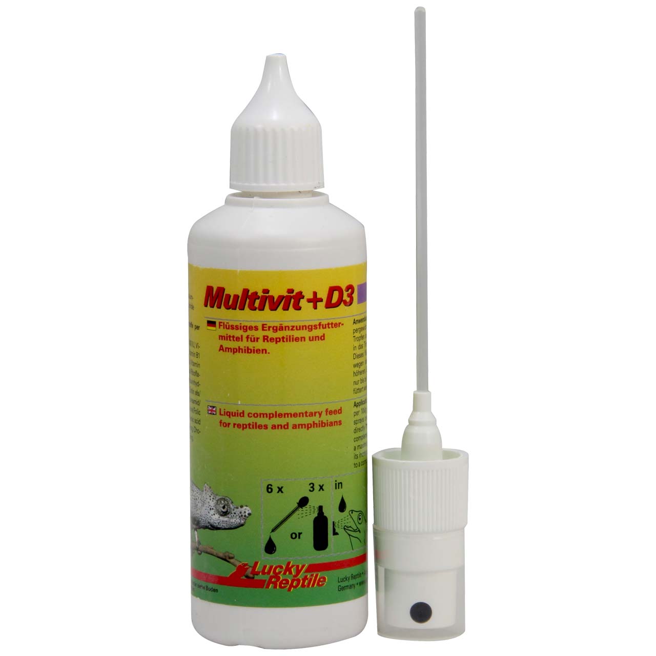 Multivit is a high quality and flexible to use liquid multivitamin product. It contains all important vitamins including vitamin D3. The big advantage lies in its flexible application forms. The packaging includes a dripper and a spray head. With the spray head you can spray the vitamins over food but also on branches and leaves where the animals can lick it off. WIth the dripper you can add it to the drinking water or apply it directly into the animals mouth. With Multivit any application is possible and it can be ensured that the animals really take up the vital vitamins while there is never a guarantee with vitamin powder. Who is looking for a easy and comfortably to use vitamin product or has to fight concrete deficiency symptome best uses Lucky Reptile Multivit D3. We recommend the combination with Lucky Reptile PRO Mineral D3.