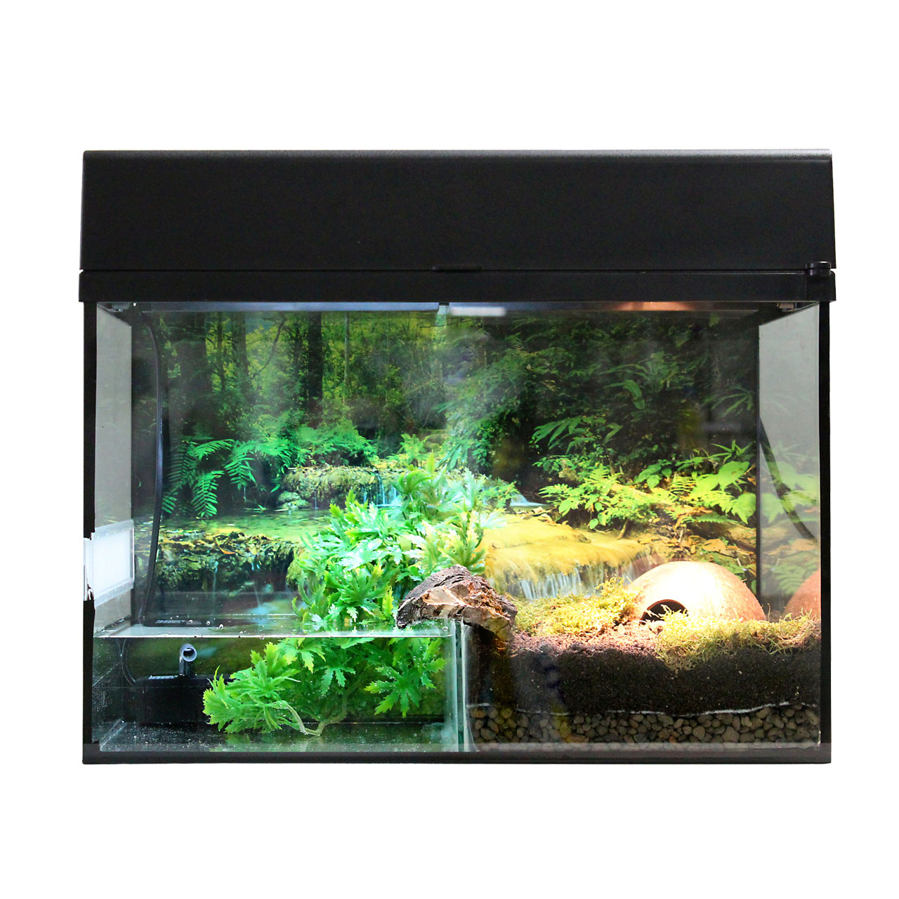 In diesem Starter Kit ist ein Glassteg eingeklebt und ein Innenfilter enthalten, so dass ein Wasserteil realisiert werden kann. So kann man optimal die attraktiven Rotbauchunken halten, die für Action im Terrarium sorgen. Oder gemütlichen aber knuffigen Pacman Frosch, der so heißt, weil er ein riesiges Maul hat und als Lauerjäger praktisch alles verschlingt, was vorbeikommt und ins Maul passt. Natürlich kann man auch andere Amphibienarten in diesem Starter Kit halten. Ihr Fachhändler berät sie gerne.