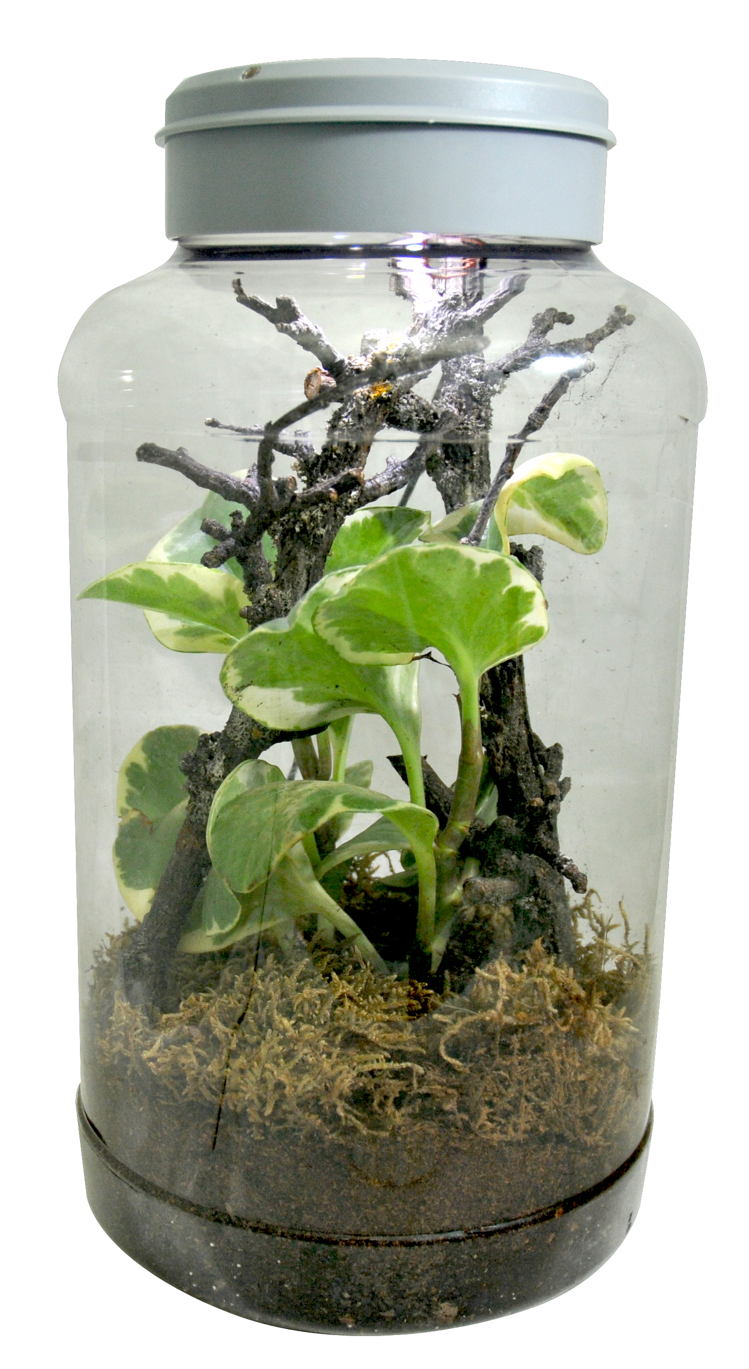 Our Insect Tarrium is ideal for explorers and those who want to be one. It can house mantids, stick insects, beetles, spiders and many other small invertebrates and even aquatic species. For most animals like insects and snails that children find outside on their excursions the InsectTarrium is the perfect container to watch them for a while before releasing them again into the wild. And for adults the attractive cylinder shaped tank with its LED lighting offers diversion on the desk. The InsectTarrium is made of robust PET plastic. The removable LED lid contains a fine ventilation mesh, feeding door and an LED light unit with two daylight and one moonlight LED. A light sensor automatically switches over to moonlight when it is getting dark. We also offer attractively equipped Insect Tarriums. In addition to the "Desert" variant for desert dwellers, two insect Tarriums are available, in which many animals from humid regions can be kept. A particularly appealing decoration-Tarrium completes the quartet.