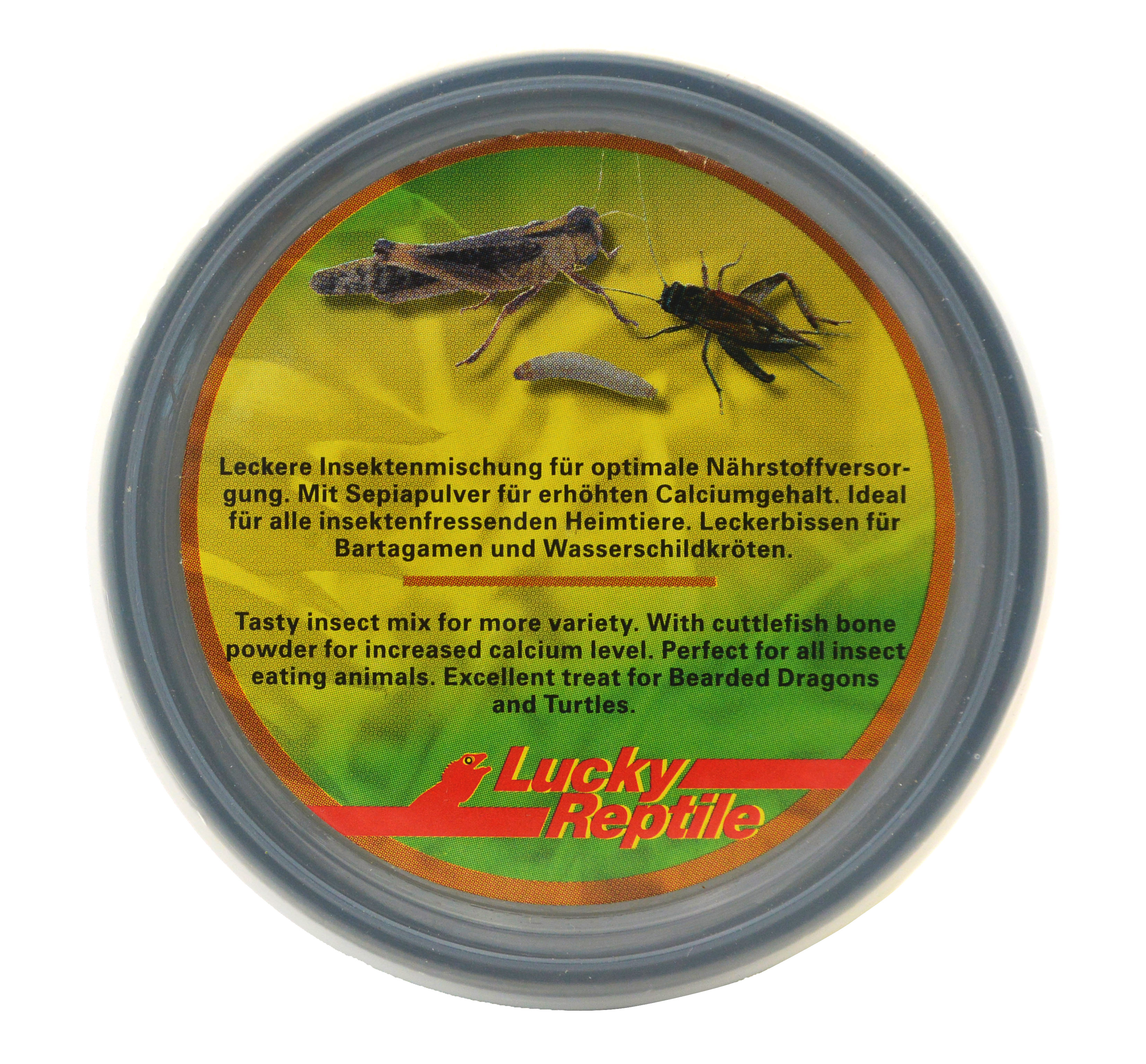 Lucky Reptile Herp Diner Insect Blend enthält große Grillen, mittlere Heuschrecken und Bambusmaden, um den Tieren ein abwechslungsreiches und nahrhaftes Futter zu bieten. Die Zugabe von Sepiapulver sorgt für einen erhöhten Calciumgehalt und ein optimales Calcium-Phosphor Verhältnis verglichen mit lebenden Insekten. Durch den speziellen Konservierungsprozess, der die Nährstoffe erhält, ist die Akzeptanz sehr hoch. Herp Diner Insect Blend ist für alle insektenfressenden Reptilien und Vögel geeignet. Vor allem eignet es sich hervorragend für Bartagamen und auch größere Wasserschildkröten. Feuchtegehalt 72,8%, Rohprotein 14,6%, Fettgehalt 9%, Rohfaser 2,8%, Calcium-Phosphorverhältnis 6:1,5